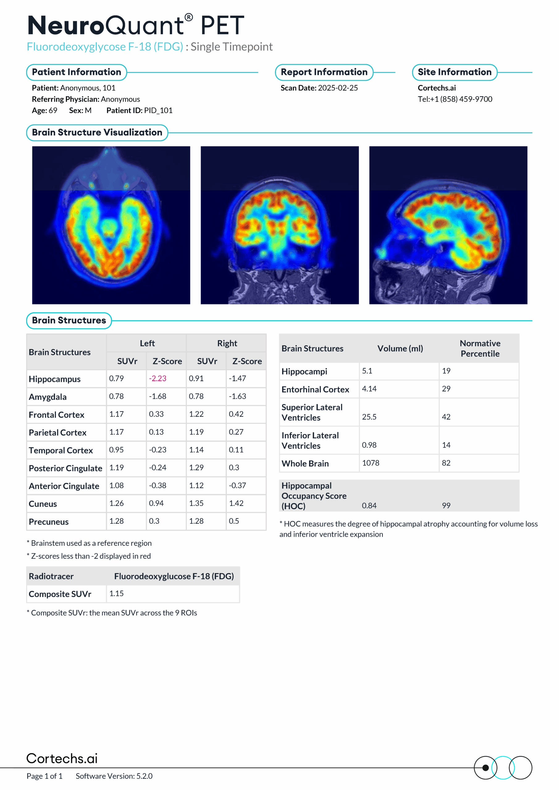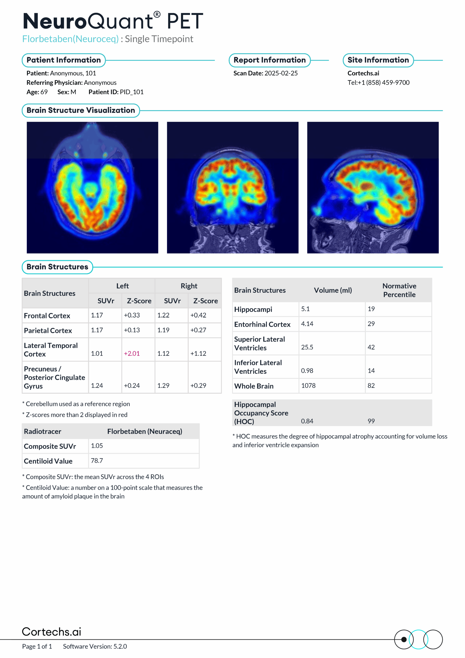 Automatically quantify PET tracer bindings localized to brain structures identified by NeuroQuant® 3D T1 MRI segmentation. Select between amyloid tau and FDG tracers for visual and statistical (Z-score) comparisons of each normalized regional PET tracer value to normative population data.